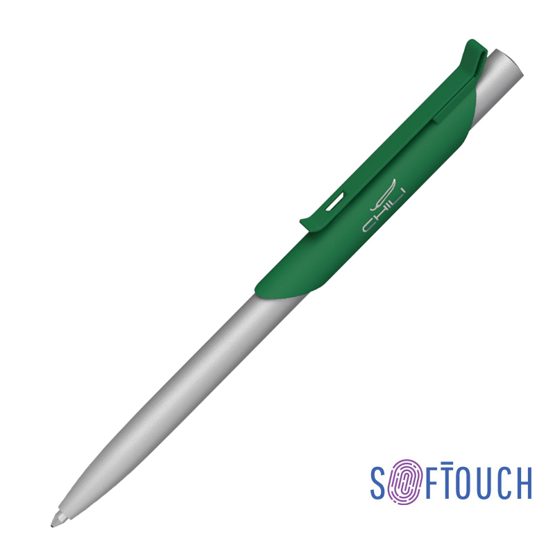 Ручка шариковая 'Skil', серебристая с темно-зеленым (7728U), покрытие soft touch, хромированная подложка на корпусе ручки и на клипе, синий стержень 1 мм артикул: 6918-61S