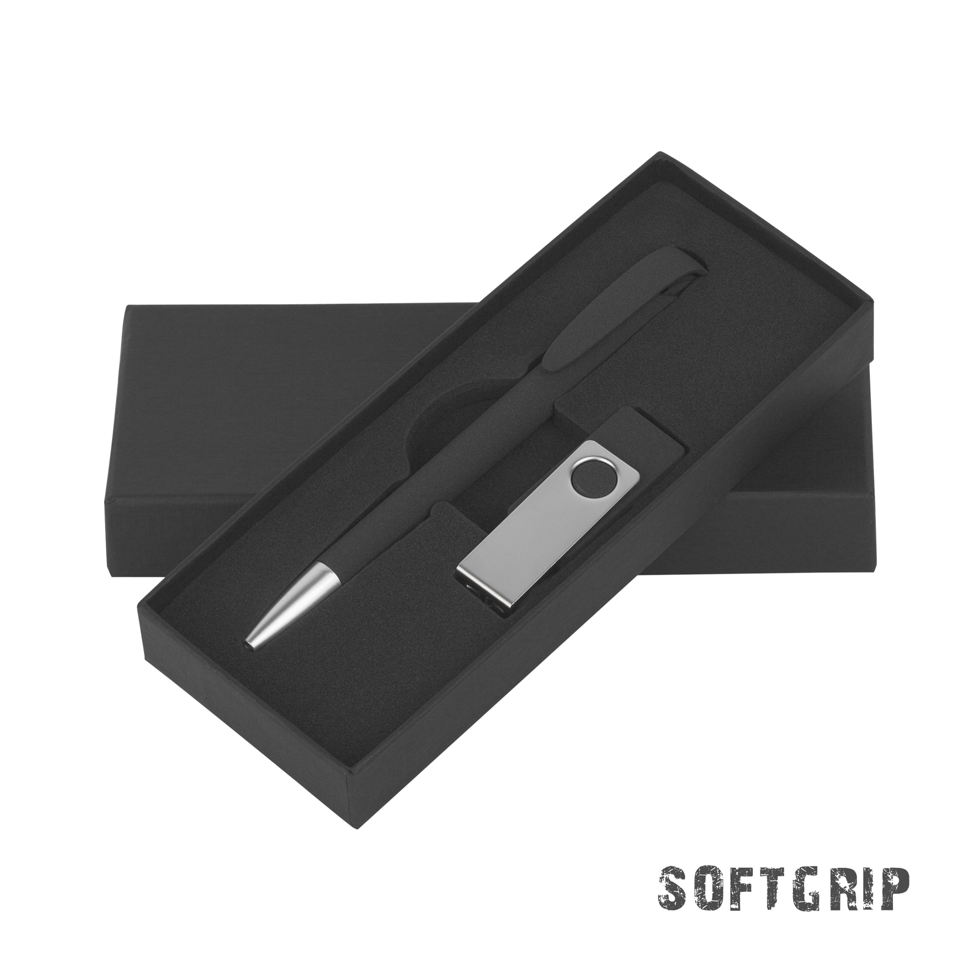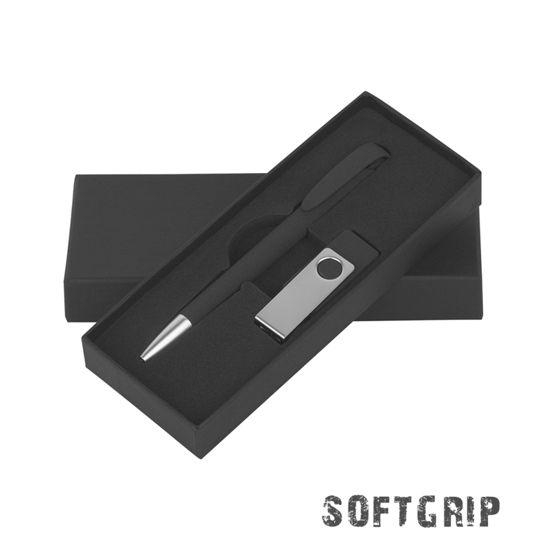 Набор ручка JONA Softgrip M (41128) + флешка TWISTAsoftgrip MS (KP110) 16Гб в футляре(6848). Ручка: корпус и клип черный (ASG). Флешка: корпус черный (ASG), клип и боковая панель мат.сер.(CR4) артикул: 70128-3/16GB