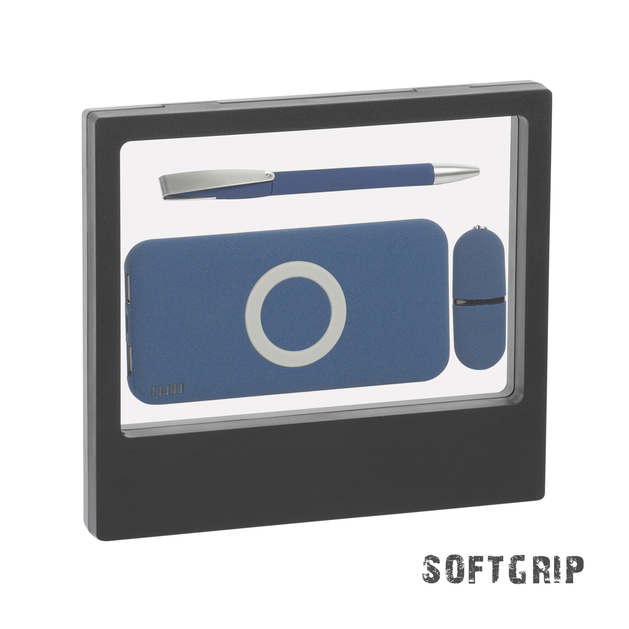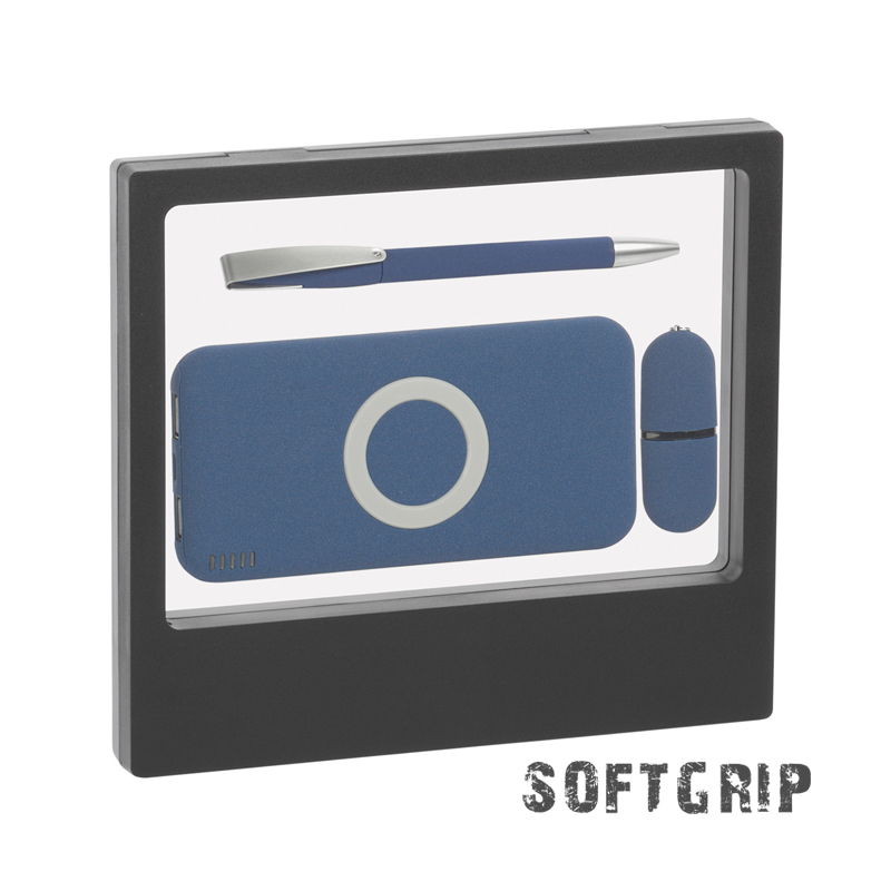 Набор ручка 'COBRA SOFTGRIP MM' 41070-21 + флешка 'Камень' 8837-21/16Gb + источник 'Камень' 8855-21, емкость 8000 mAh, покрытие soft grip, темно-синий/черный артикул: 8859-21/3