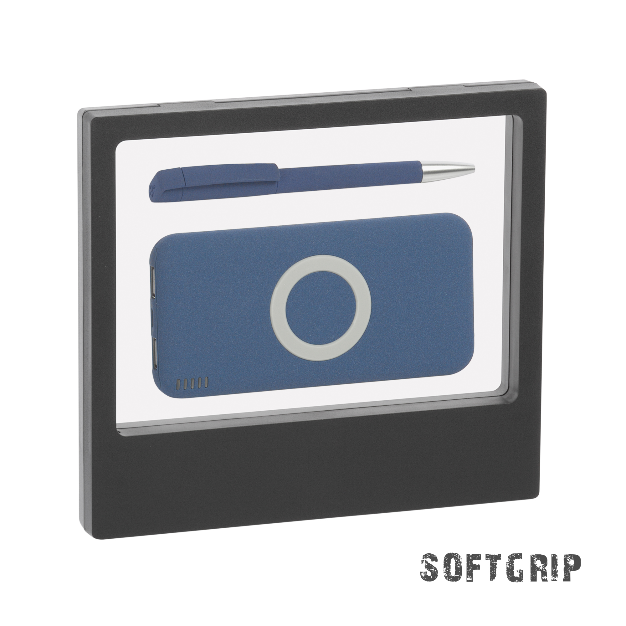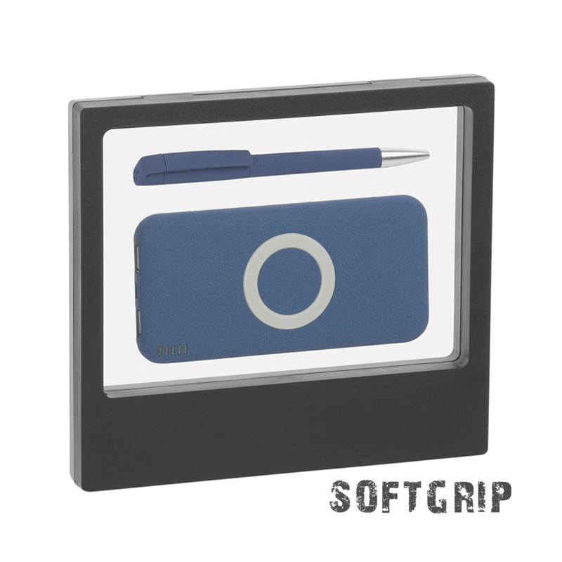 Набор ручка с флеш-картой «TURNUSsoftgrip M» 60278-21/16Gb + источник 'Камень' 8855-21, емкость 8000 mAh, покрытие soft grip, темно-синий/черный артикул: 8857-21/3/16Gb