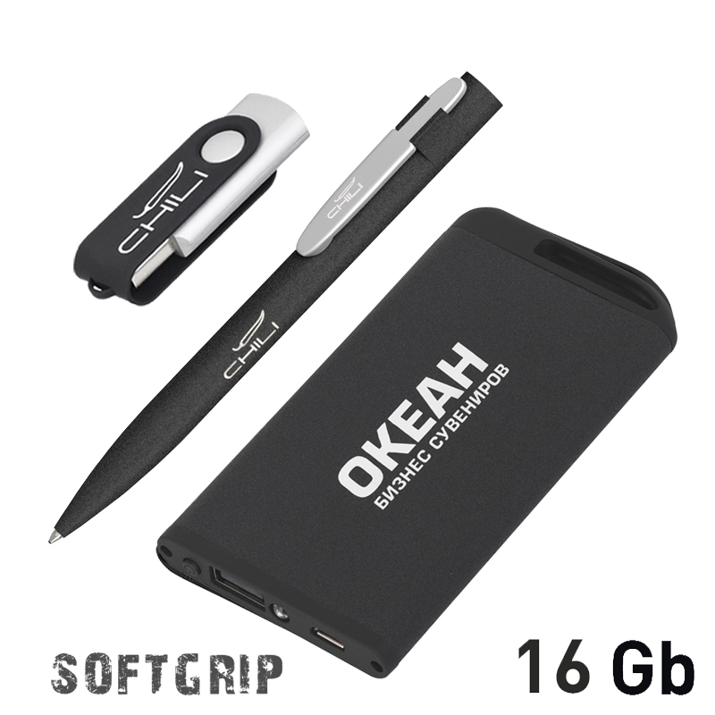 Набор Ручка шариковая 'Lip SOFTGRIP' 6941-3/SS + флеш-карта 'Vostok SOFTGRIP' 6951-3/16Gb + зарядное устройство 'Theta SOFTGRIP' 6949-3, 4000 mAh, черный с серебристым, покрытие soft grip артикул: 6987-3/SS/16Gb