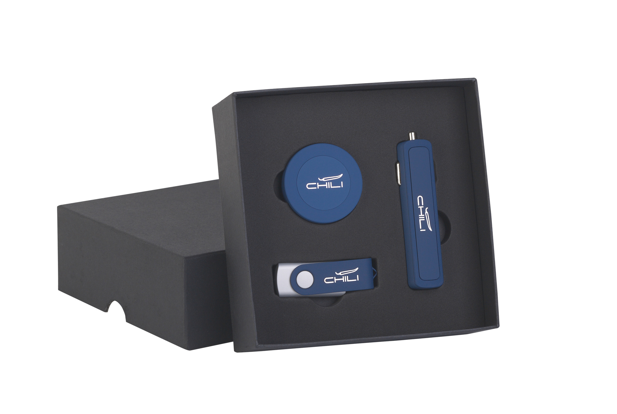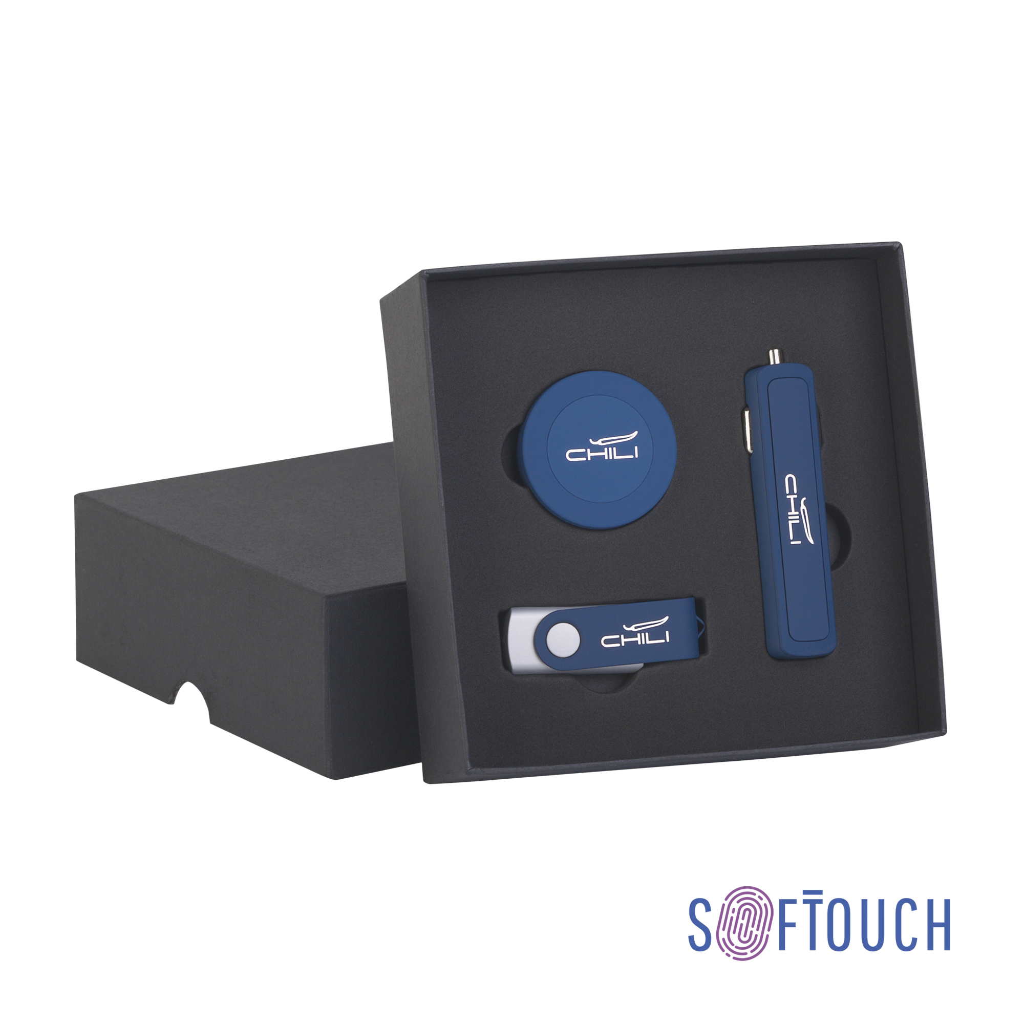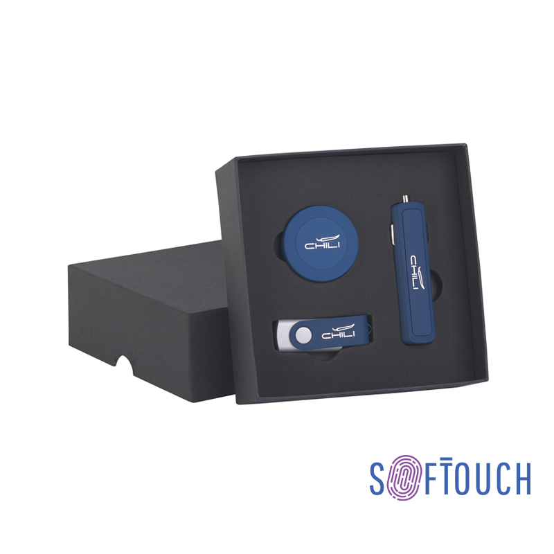 Образец набора автомобильное ЗУ 'Slam' 6912-21 + флешка'Vostok' 6874-21S (без чипа) + магнитный держатель 'Allo' 6915-21 в футляре, темно-синий, покрытие soft touch артикул: 6943-21_GR